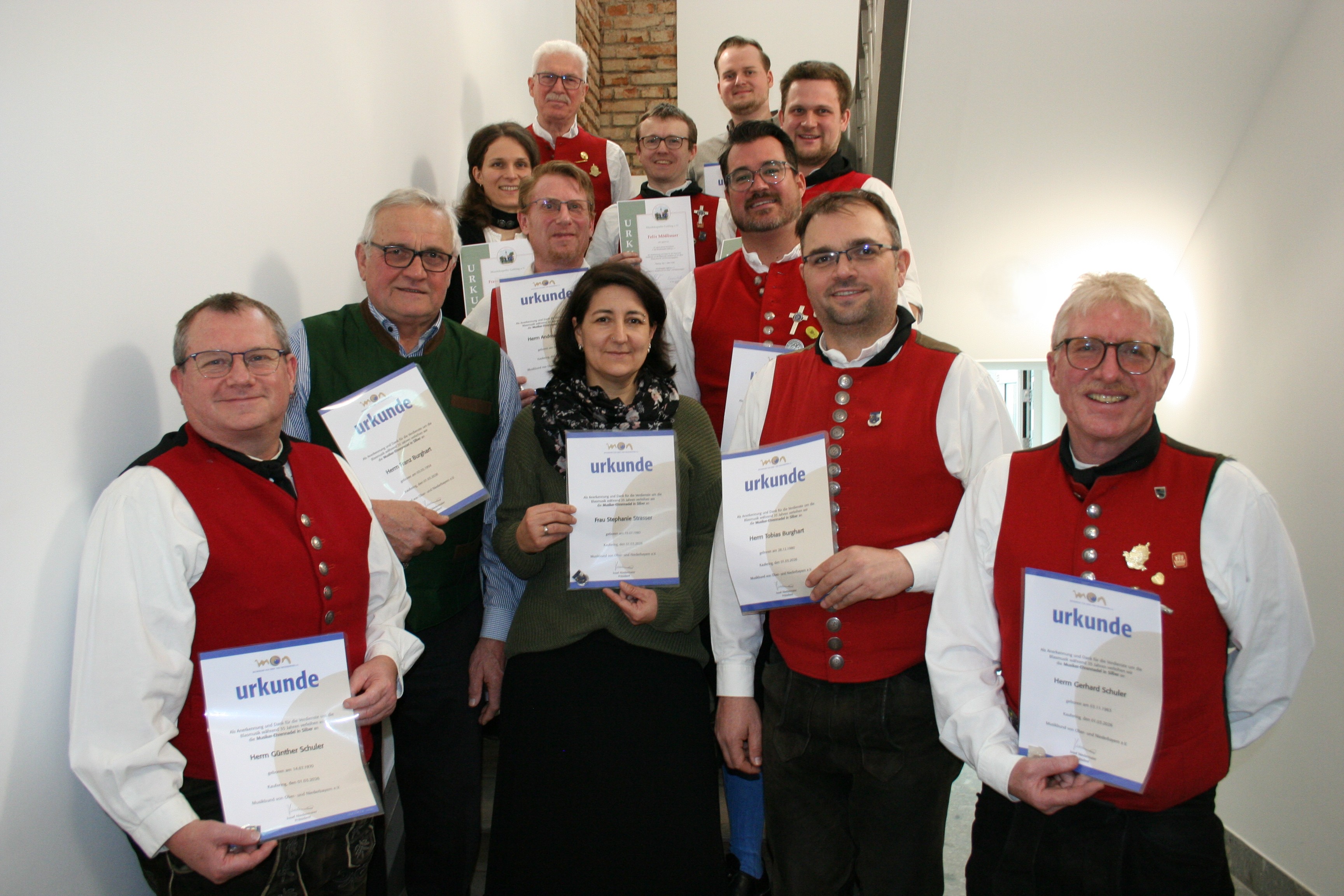 Der Höhepunkt der Mitgliederversammlung war die Auszeichnung vieler Musiker für ihren langjährigen Einsatz in der Musikkapelle Gelting. Vorsitzender Gerhard Schuler zeichnete für 15 Jahre aktives Musizieren Anke Hierl (entschuldigt), Johannes Hierl und Dr. Wilm-Christian Haase (entschuldigt) mit der Ehrennadel des Musikbundes von Ober- und Niederbayern (MON) in Bronze und einer Urkunde aus. Für 20 Jahre Mitgliedschaft wurde mit einer Urkunde und Geschenk geehrt Josef Bauer-Eberhart jun., Georg Eberhart, Hans Dieter Gohl (entschuldigt), Felix Mößbauer und Franziska Winterstein. Besondere Auszeichnungen des MON konnte Carola Mütze, Stellvertretende Vorsitzende, vornehmen. Sie durfte sieben Gründungsmitglieder der Musikkapelle Gelting mit einer Urkunde und Anstecknadel in „Silber 35“ auszeichnen. Es waren dies Franz Burghart, Tobias Burghart, Matthias Frick, Ehrendirigent Günther Schuler, Gerhard Schuler, Andreas Schuler und Stephanie Strasser.