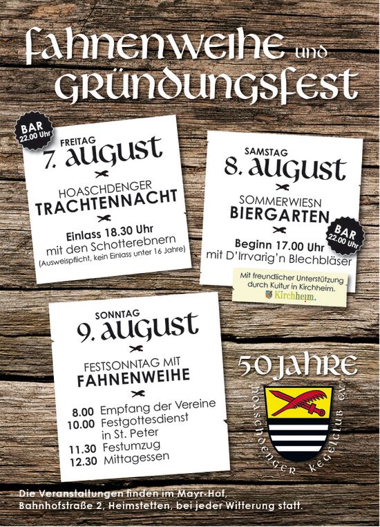 Liebe Musikfreunde. Am Sonntag den 09.08. könnt ihr die Musikkapelle bei der 50 Jahre Feier des Hoaschdenger Kegelclub e.V. in Heimstetten hören. Schaut's vorbei